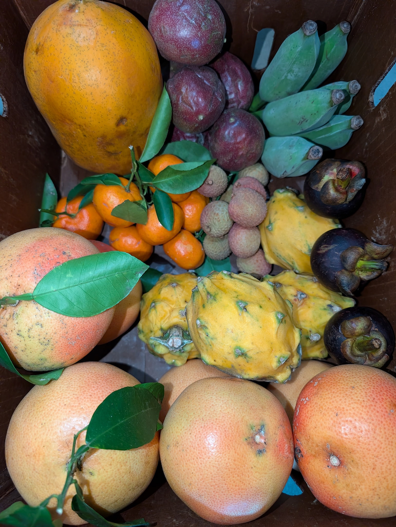 These boxes include seasonal and fresh fruit picked within days. Boxes contains seasonal assorted fruit. Expect bananas, papaya, avocados, dragon fruit, cherimoya, sugar apple, citrus and more!